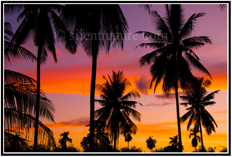 Spreading coconut branches put an exclamation mark on a color filled Kao Sok sunset. Sirathani Province, Thailand